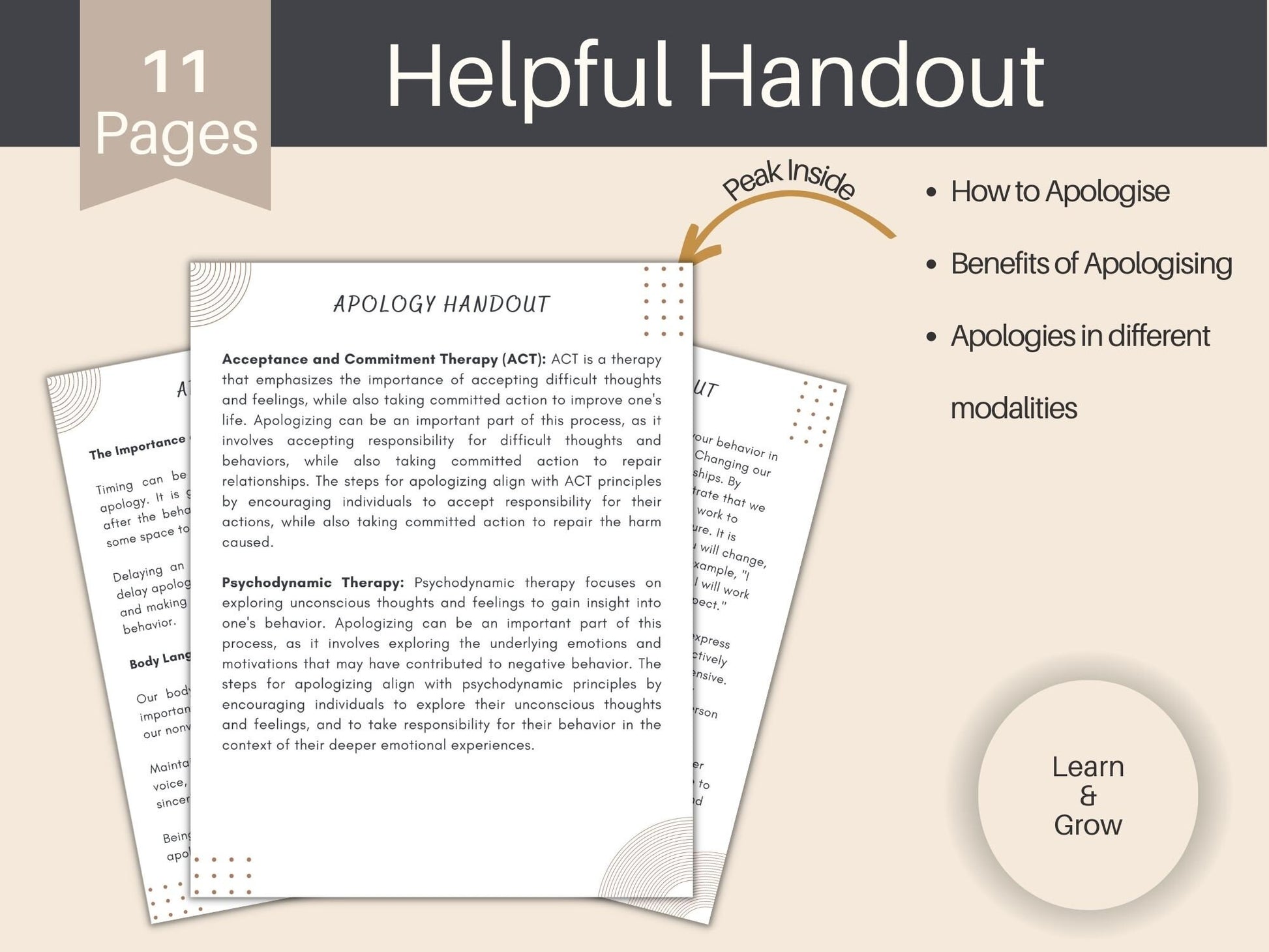 The flashcards provide a simple, 7 step list for apologizing effectively, while the accompanying handout provides detailed explanations and additional information on topics like the role of empathy, the power of a sincere apology, and the importance of self-reflection. With these tools, you'll be able to navigate difficult conversations with ease, build stronger relationships, and promote healing in your personal and professional life.