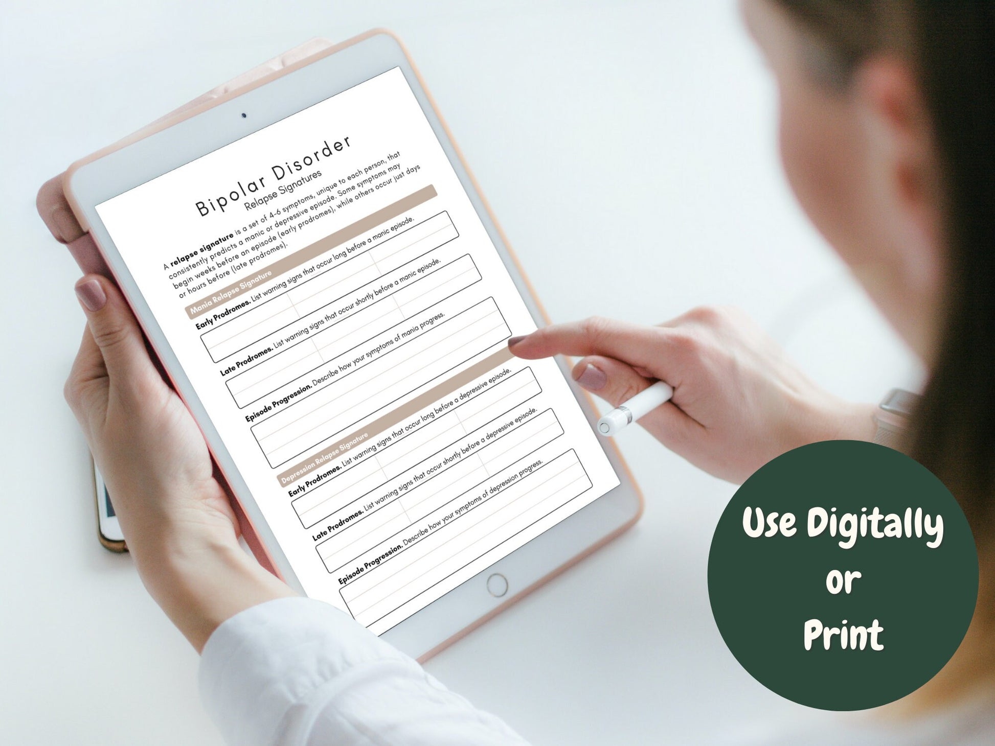 A relapse signature is a set of 4-6 symptoms, unique to each person, that consistently predicts a manic or depressive episode. Some symptoms may begin weeks before an episode (early prodromes), while others occur just days or hours before (late prodromes). Use this worksheet to explore and record your individual signatures, or the signatures of your clients to help bring awareness.