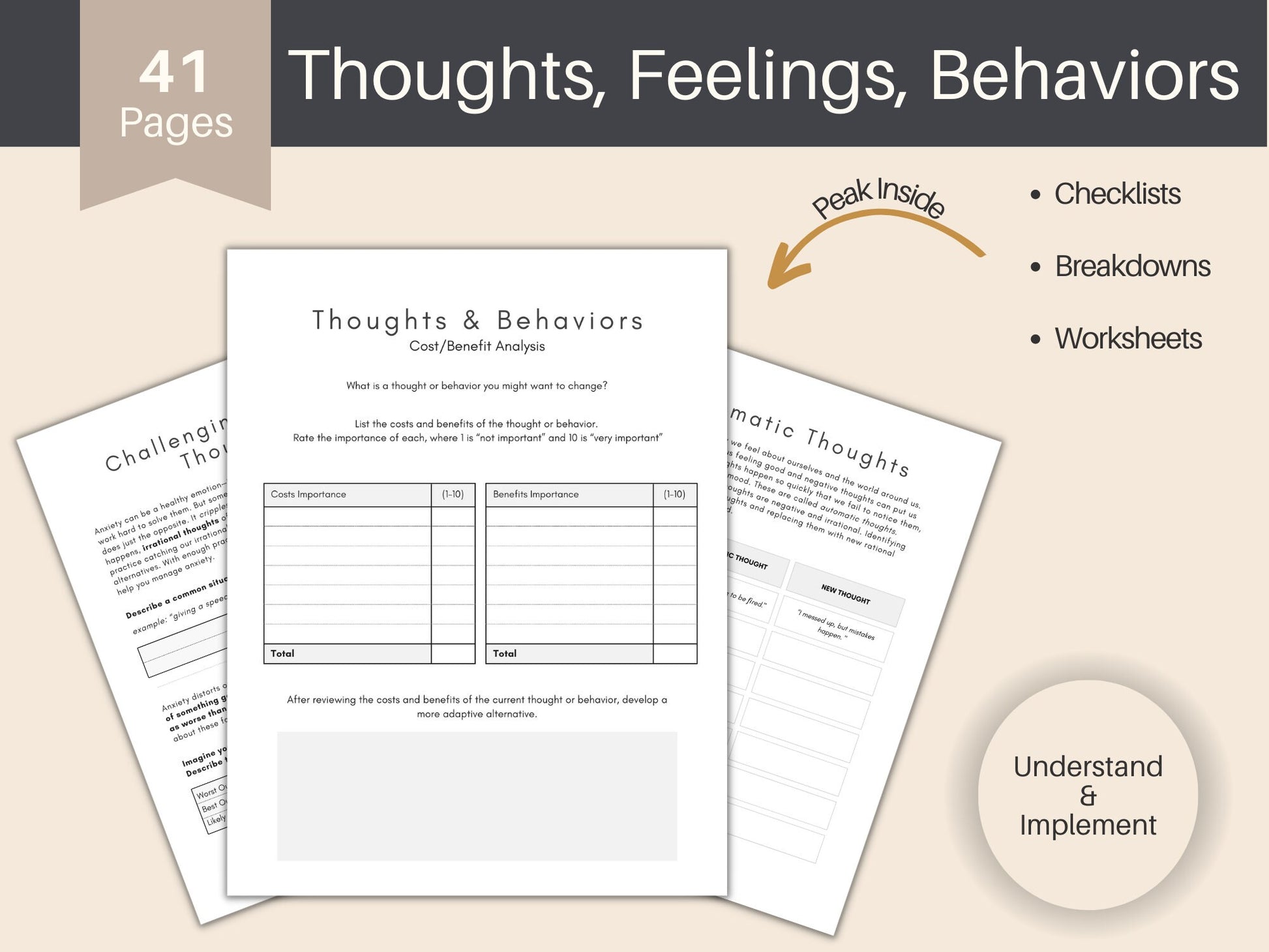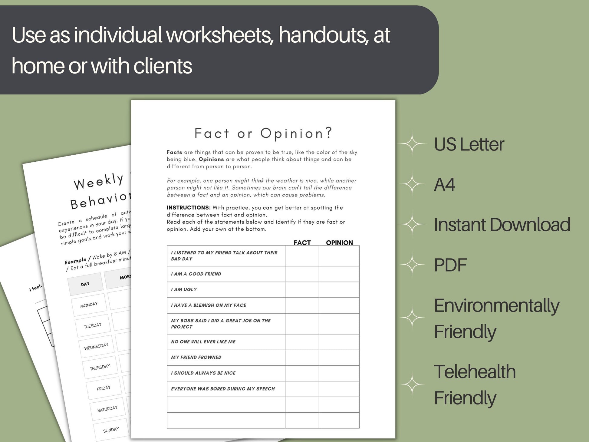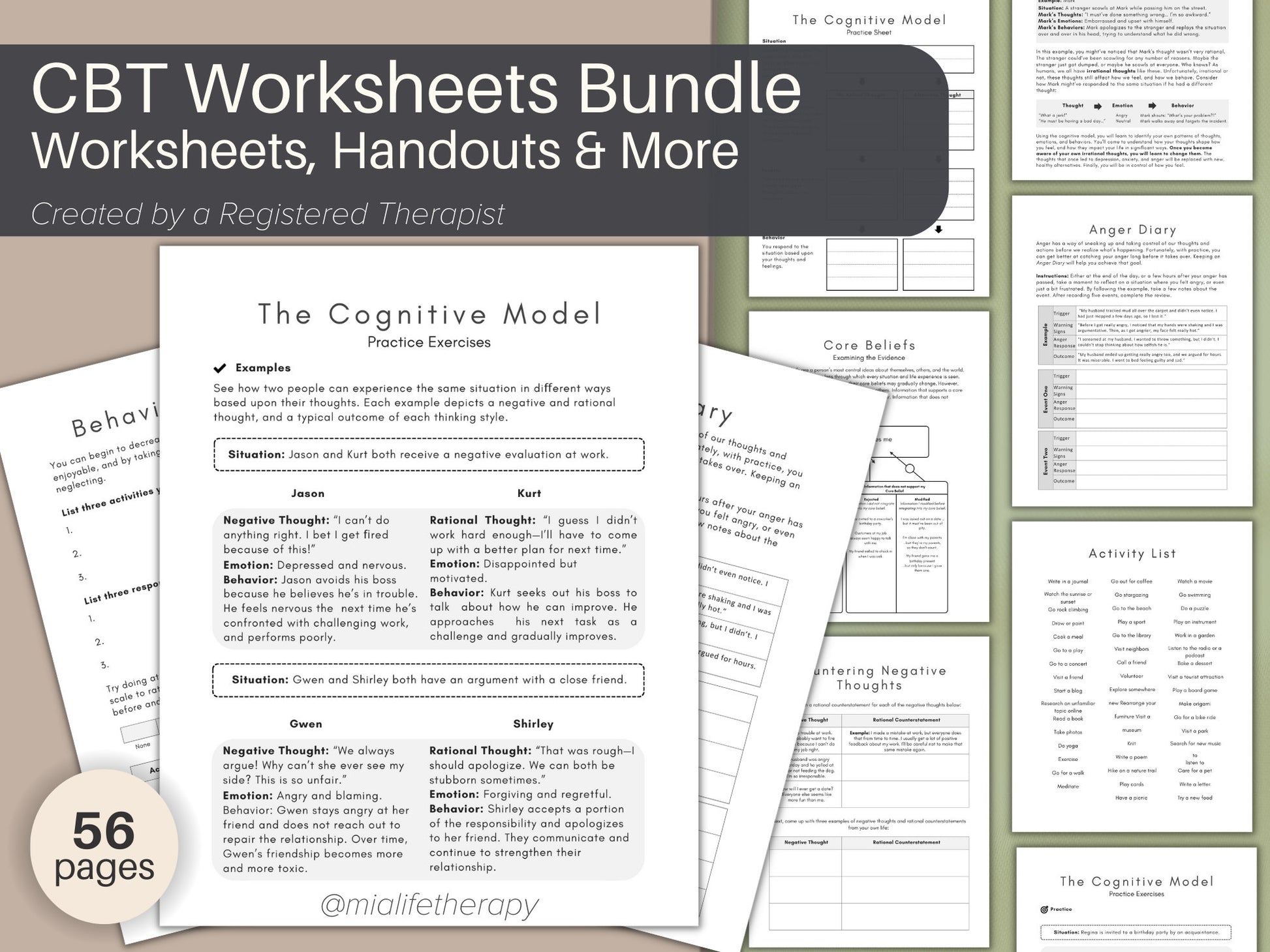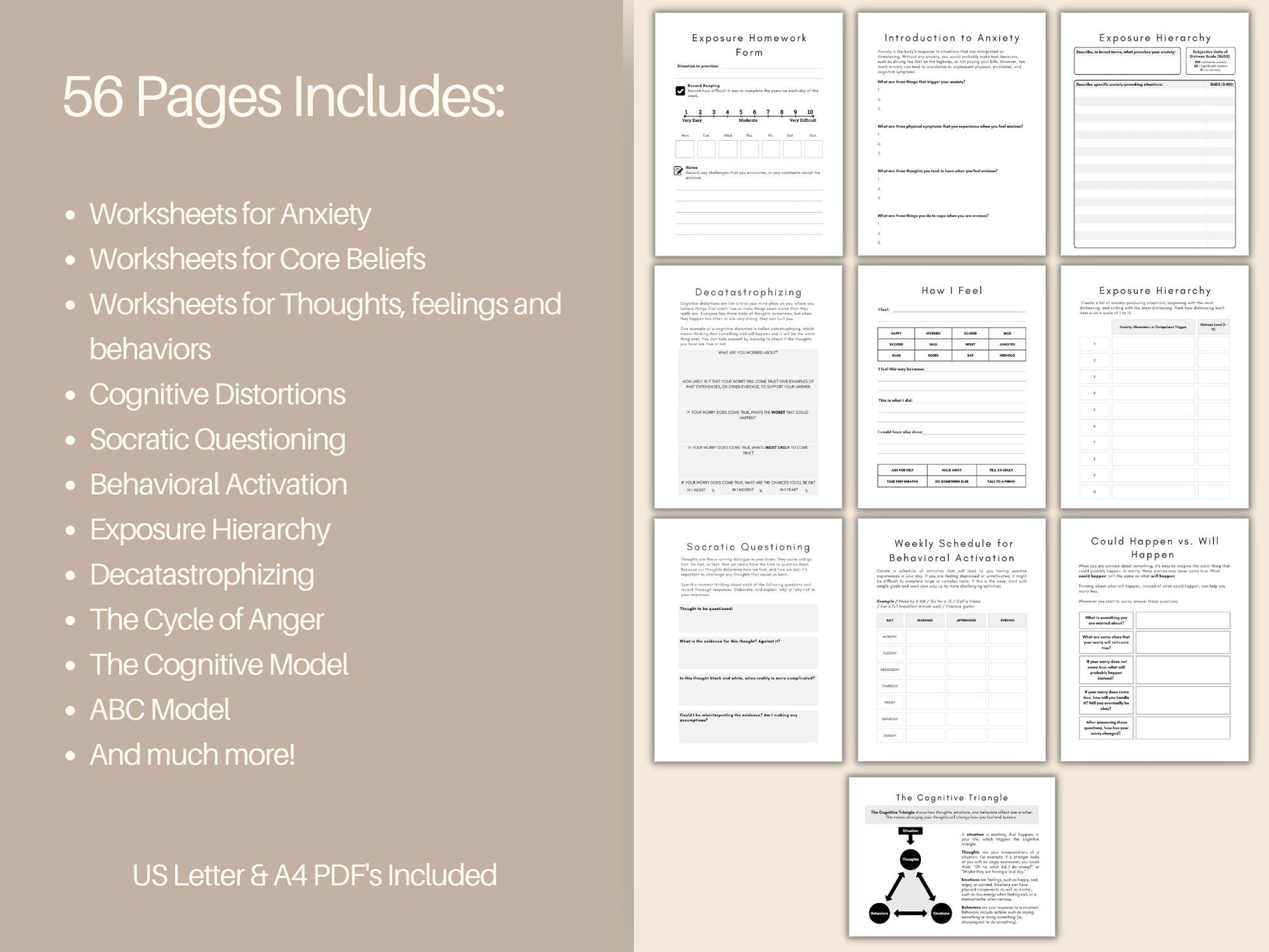 Perfect for therapists, coaches, and self-improvement enthusiasts, our comprehensive CBT Value Pack offers a range of engaging and easy-to-follow worksheets and handouts. This thoughtfully curated collection covers essential cognitive behavioral therapy concepts, including thought tracking, challenging cognitive distortions, and establishing healthy coping strategies. Designed to inspire growth and self-reflection, these resources are suitable for use in both personal and professional settings. With their visually appealing layouts and step-by-step guidance, these tools empower individuals to tackle anxiety, depression, and other emotional challenges head-on, ultimately paving the way for a more balanced and fulfilling life. Elevate your therapeutic practice or personal self-care journey with this indispensable CBT Bundle Pack.
