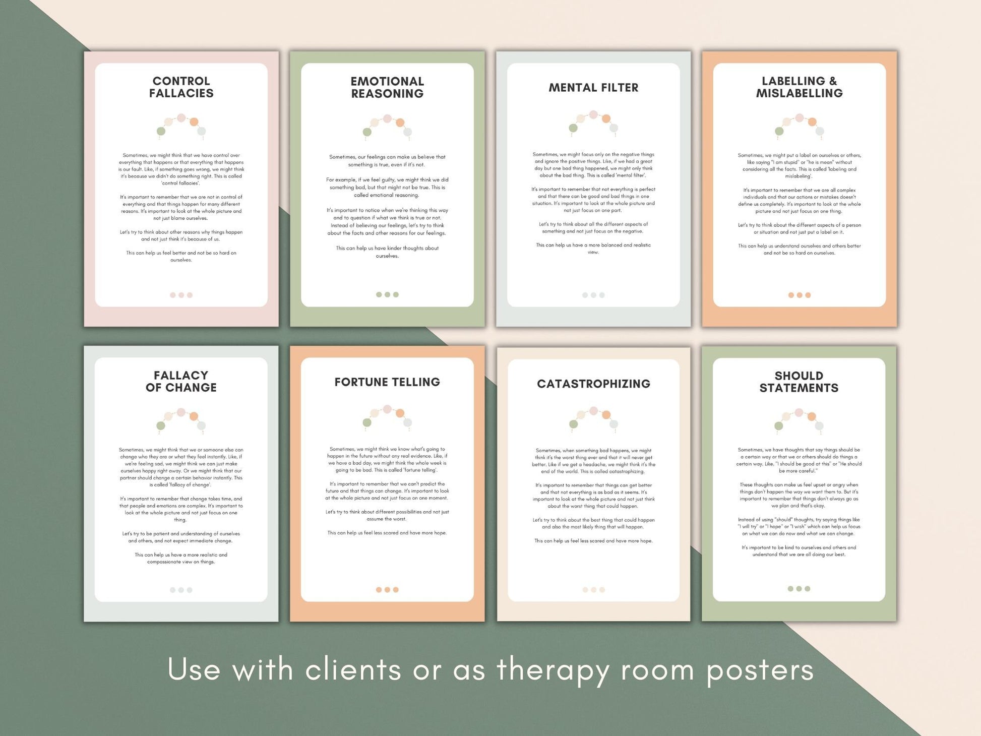You will receive an instant digital download pdf of 16 pages that include 15 x cognitive distortion cards and 1 x summary poster. These cards can support you and your clients to understand and challenge cognitive distortions or unhelpful thinking patterns. The cards can be used in unlimited ways, and offer a great way to explore, understand, and identify symptomology.