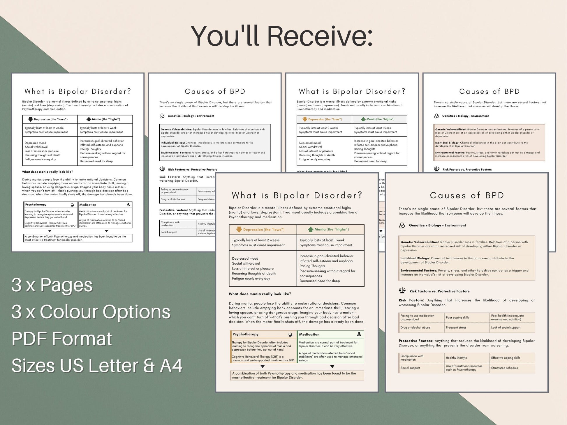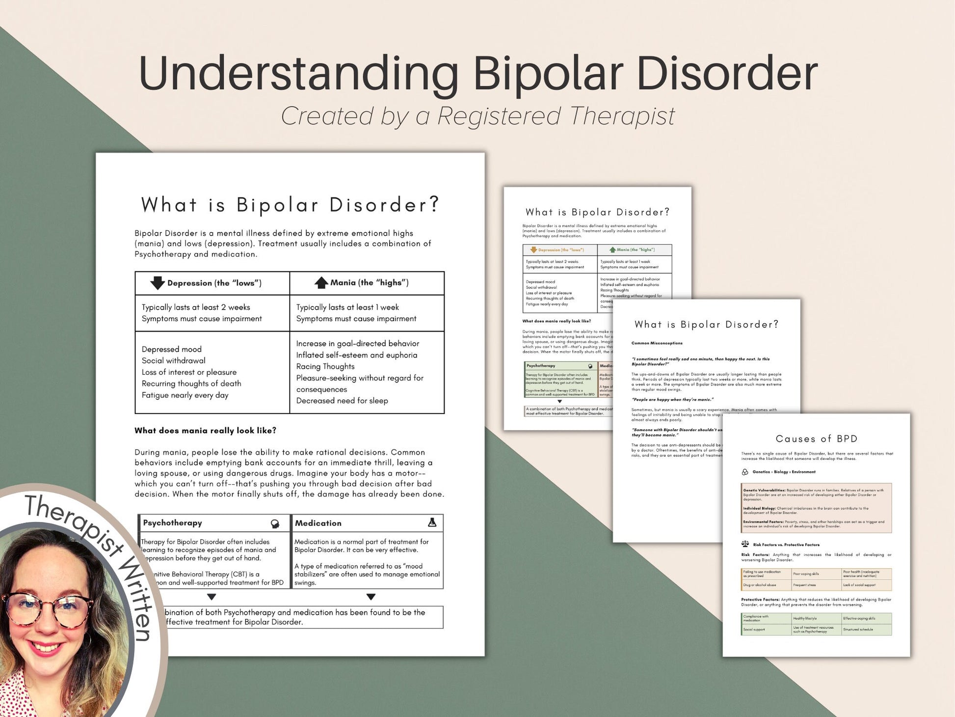 3-Page Guide to Understanding Bipolar Disorder - a clinical tool for therapists, counselors, and mental health professionals! Equip your clients with the essential knowledge and support they need, using this comprehensive resource. This guide is designed to empower clients with the information they need to better understand and manage their bipolar disorder. This resource covers the fundamental aspects of bipolar disorder, including symptoms, treatment options, and coping strategies.